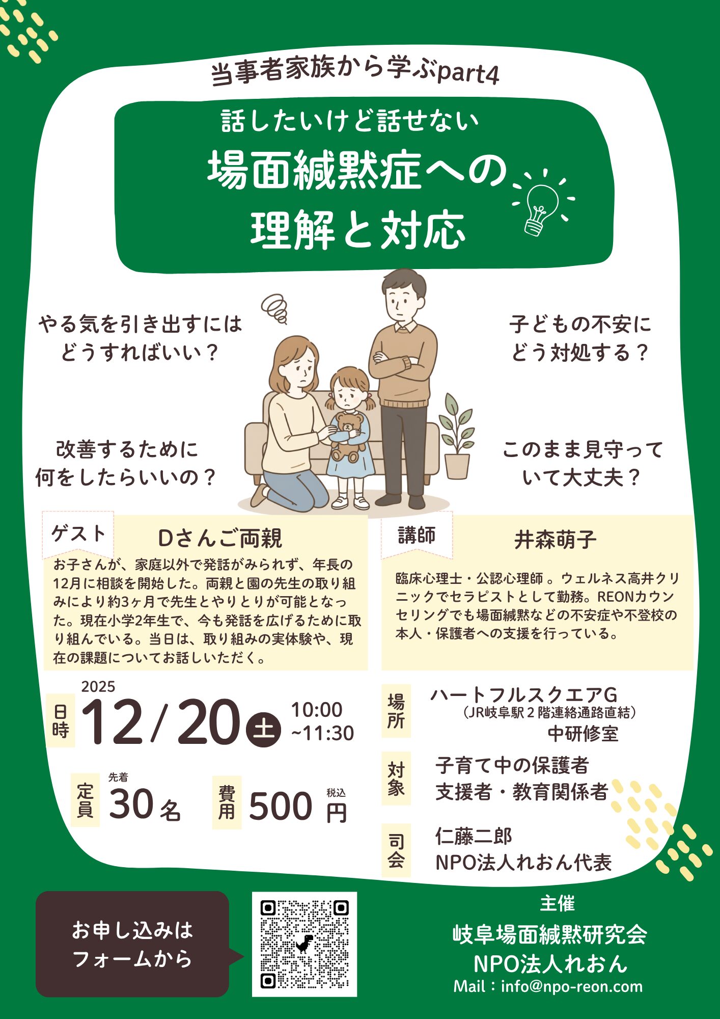場面緘黙のお子さんを持つ保護者の方や、支援に携わる方をはじめ、ご興味ある方はふるってご参加ください。