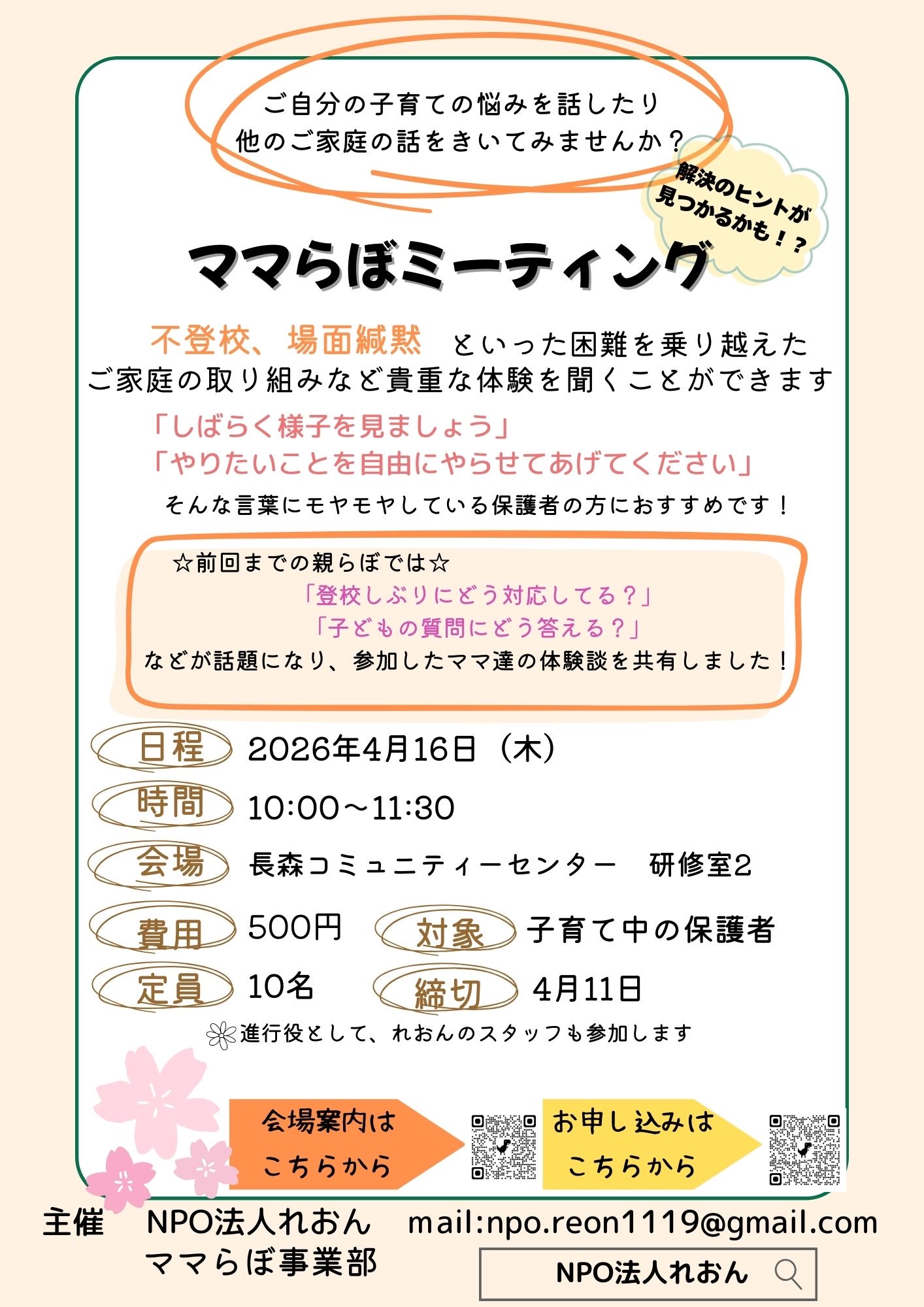 ママらぼミーティングは子育ての悩みについて、同じく子育て中の親と話ができる会です。